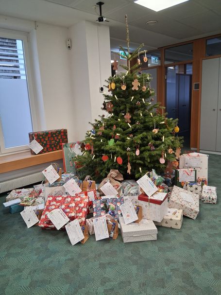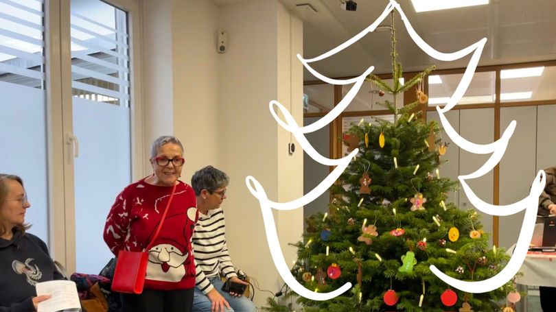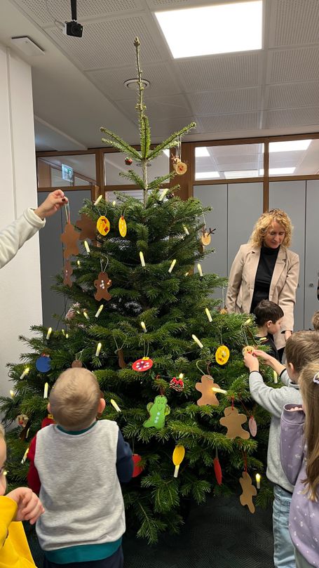 Am 2. Dez. 2025 war es soweit : der Tannenbaum stand im Schalterraum der KSK. Es duftete nach Waffeln, die gemalten Wunschzettel kamen in den Baum, die Kinder vom AWO Kindergarten haben gesungen, die Erwachsenen auch. Unser ehemaliger Bürgermeister, Herr von Rekowski, spielte auf der elektrischen Orgel.
