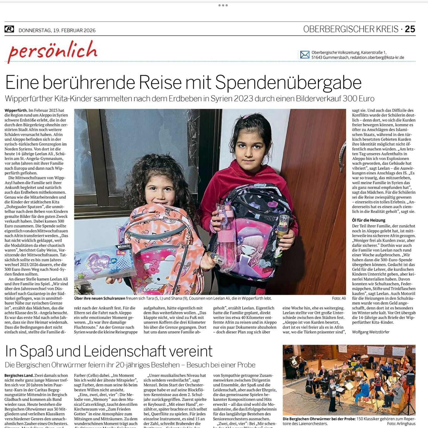 Was länge währt, wird endlich gut ! Das schwere Erdbeben im Grenzgebiet Syrien / Türkei suchte am 6. Feb. 2023 das schon vom Krieg gebeutelte Gebiet mit voller Härte heim. Spontan haben Eltern und Kinder des städt. Kindergartens Dohrgauler Spatzen gemalt und gebastelt und diese Werke an Interessierte verkauft. Dann kamen wir ins Spiel : seit nunmehr 11 Jahren in der Flüchtlingshilfe aktiv wurde uns die Aufgabe übertragen, die gesammelte Summe von € 272,00 nach Syrien zu transfe-rieren.